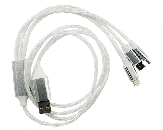 Кабель 3в1 светящийся Lightning+Type-C+microUSB - USB белый