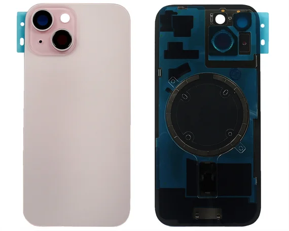 Задняя крышка (стекло) iPhone 15 (со стеклом камеры в сборе+магнит) розовая 1 класс
