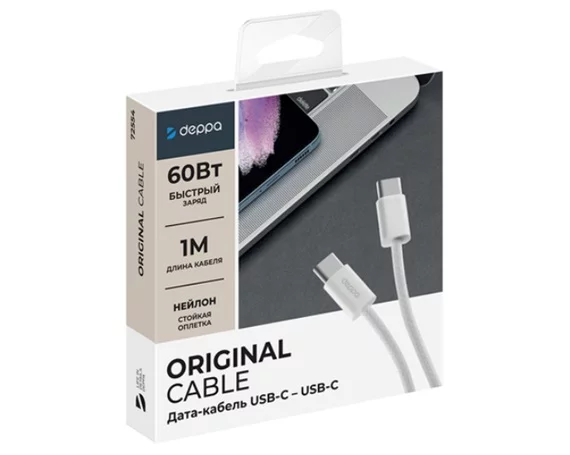 Кабель Deppa Original Type-C - Type-C 60W нейлон, белый, 1м, 72554